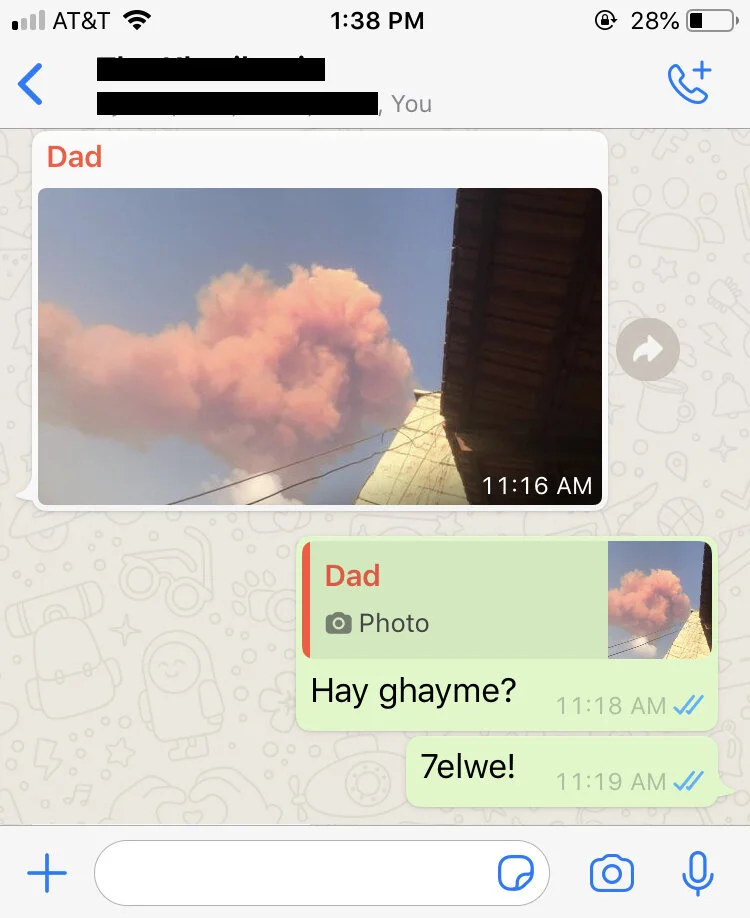 On the family WhatsApp group, my father sends a photograph taken from our house’s balcony, a pink cloud formation invading a clear blue sky. No caption. “Hay ghayme? 7elwe!” (Is this a cloud? It’s beautiful!) I responded, thinking that my father was sharing with me a blissful moment, a beautiful sunset bleeding into a water-blue sky. And then, nothing. For a little while, I continued my day, working or writing, performing some task or another.