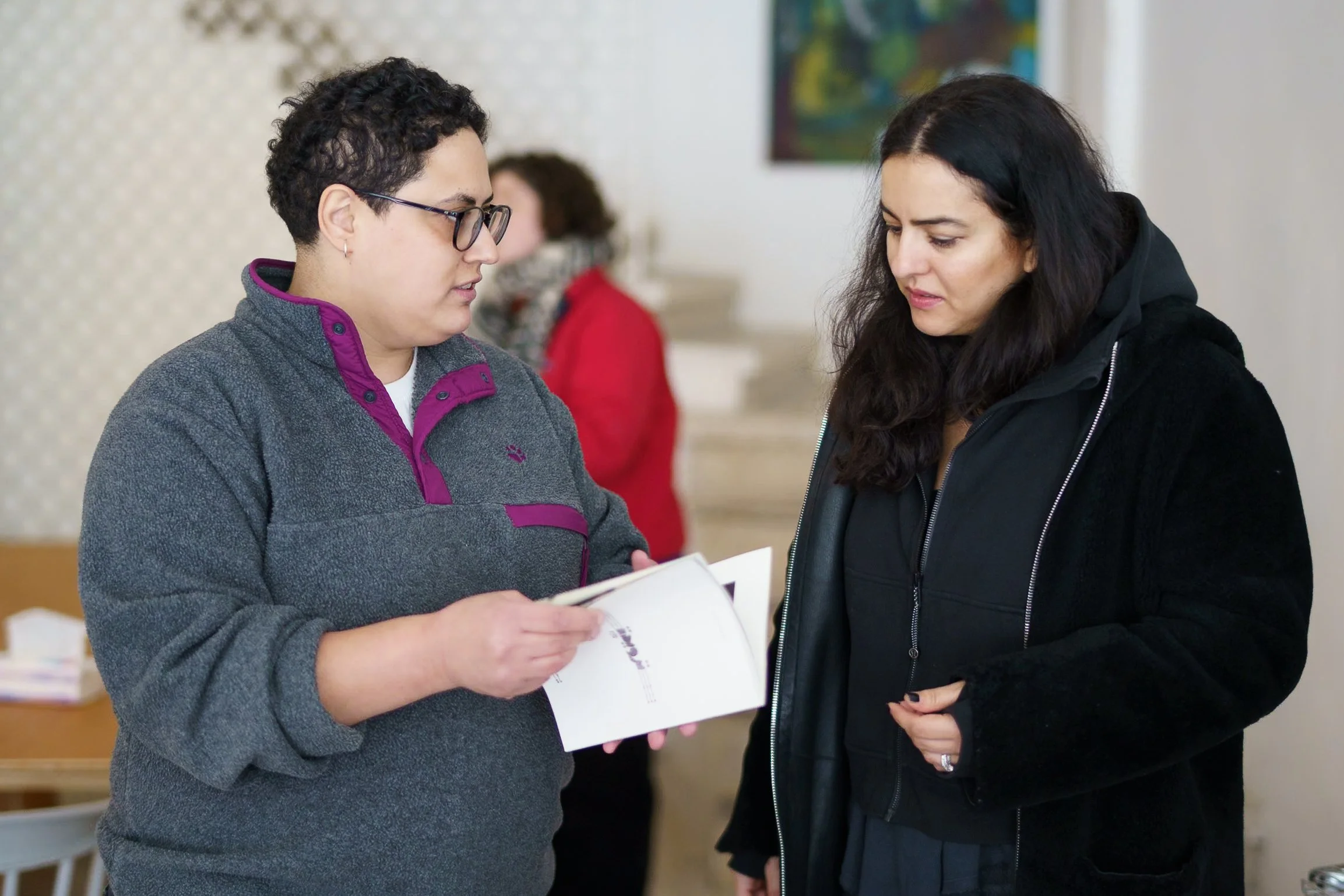 Lina Khalid shows program mentor Newsha Tavakolian a copy of Tarweedeh, a zine made by Lina’s fellow ADPP grantees that features nine ADPP photographers from/in Palestine, including Lina and our other Amman host Nadia Bseiso. Photo by Jenna Masoud.